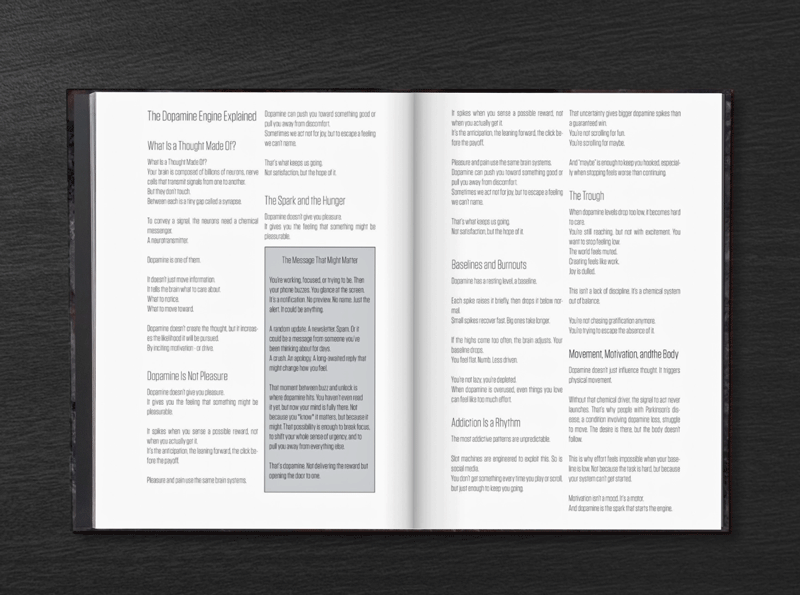 Printed as a Swiss-bound soft-touch hardcover book, Dopamine Driven Art opens flat, inviting slow, tactile reading.